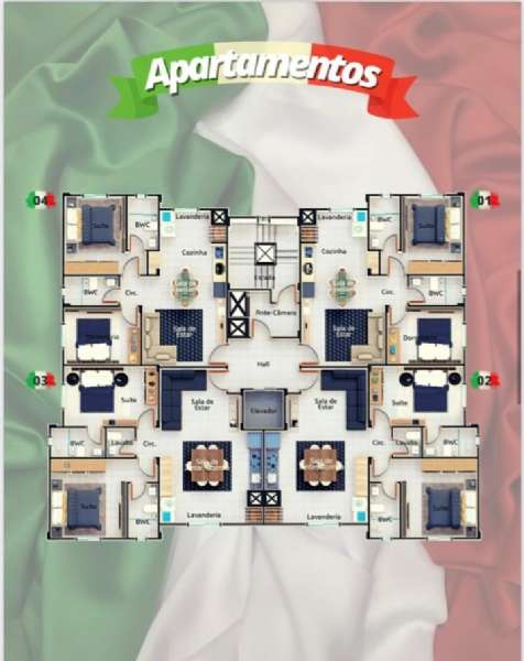 Apartamentos tipo 01 e 04 com área total de 88,00m² e 60 m² de área privativa e apartamentos tipo 02 e 03 com área total de 104,00m² e 73m² de área privativa.